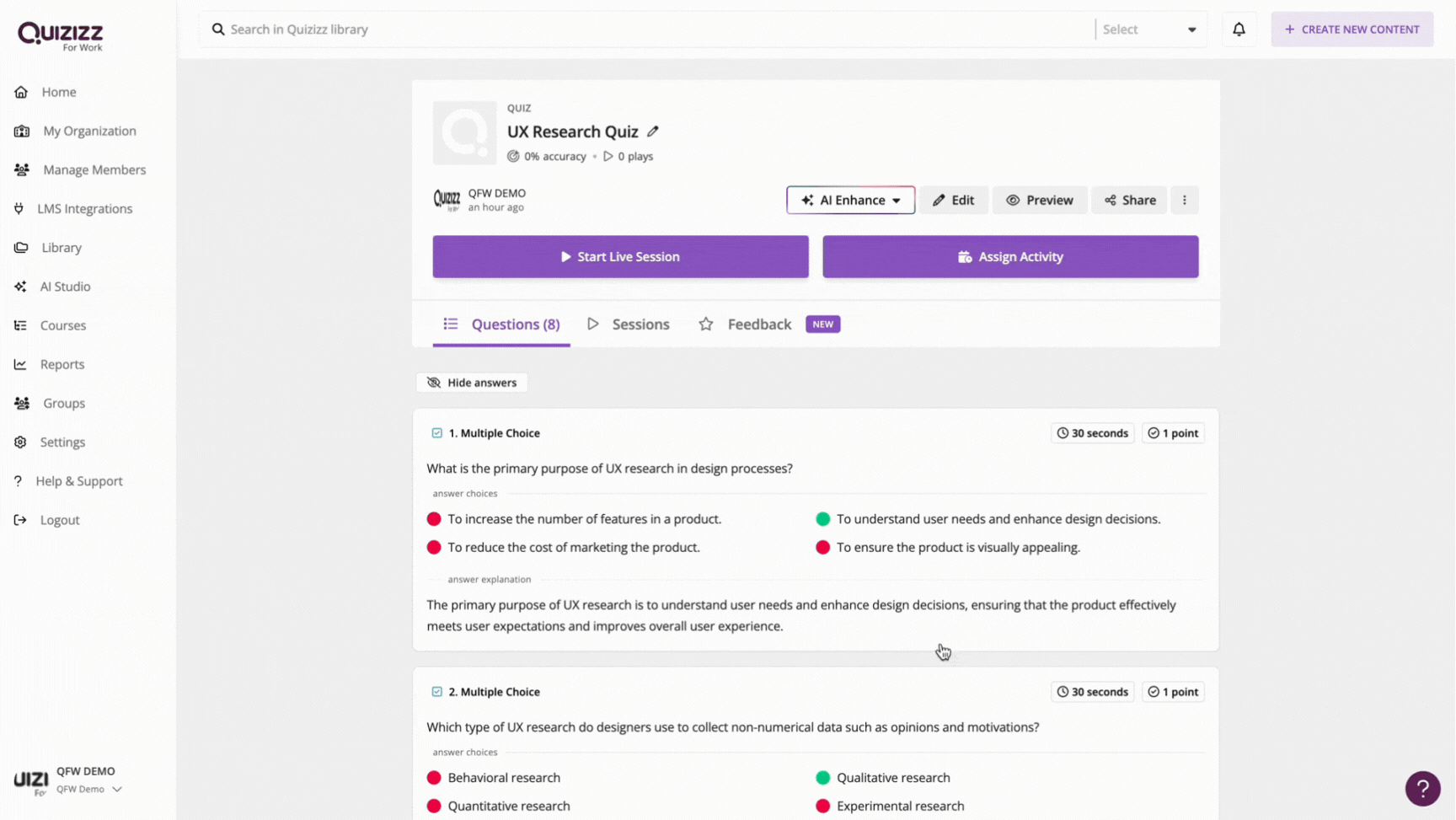 To enhance an existing quiz in your Library, you will find the ‘✨AI Enhance’ button on every question if you hover over it. Click on it and choose how you'd like to enhance your question.