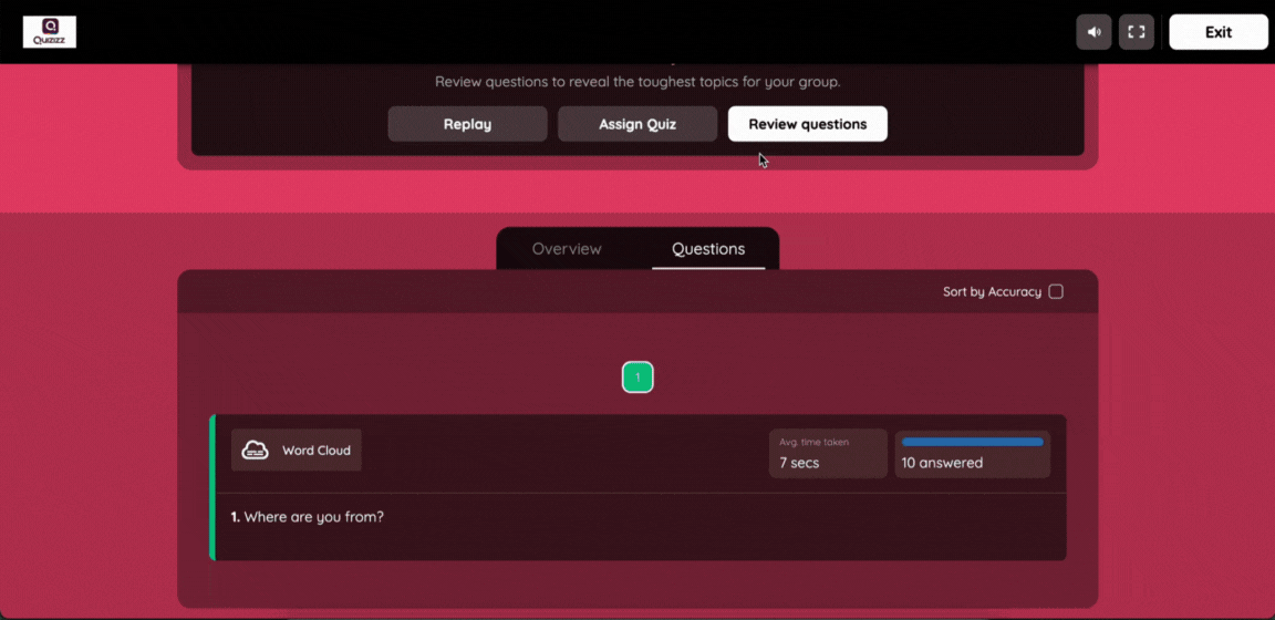 Participants can answer a Word Cloud question with up to 20 characters. As the host of the quiz, you will be able to see responses both individually and in the Word Cloud format. This helps visualize information quickly and easily, especially during live quizzes.